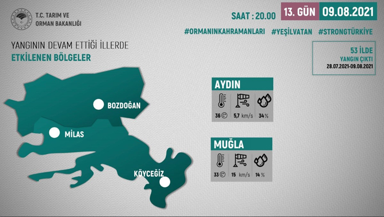 Bakanın paylaşımına göre, orman yangınlarının 13’üncü gününde Muğla’nın Köyceğiz ve Milas ilçesi ile Aydın’ın Bozdoğan ilçesindeki orman yangınlarını kontrol altına alma çalışması sürüyor.