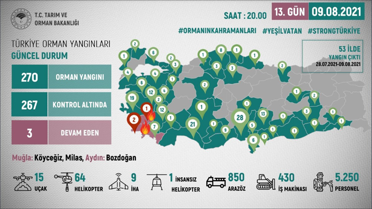 Bakan Pakdemirli, “Orman yangıları ile mücadelemiz 13 gündür #OrmanınKahramanları’nın özverili çalışmaları ile devam ediyor. 53 ilimizde çıkan 270 orman yangınının 267’sini kontrol altına aldık. Muğla ve Aydın’da devam eden 3 yangını da kontrol altına almak için tüm gücümüzle çalışıyoruz” ifadelerini kullandı. Mehmet Kalay / İHA