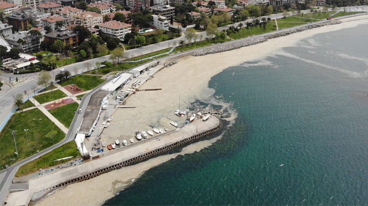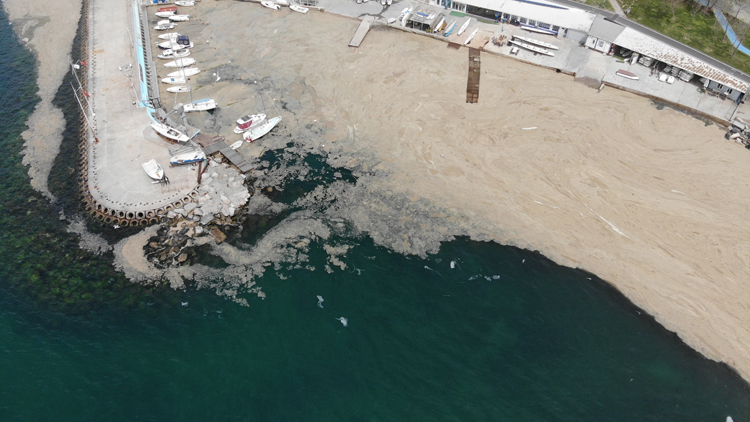 İstanbul’un sahillerinde yoğunluk gösteren deniz salyaları etkisini sürdürmeye devam ediyor. Caddebostan Sahili’nde yoğun bir kokuya da neden olan deniz salyaları havadan görüntülendi.