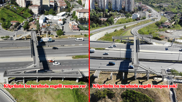 Maltepe’de E-5 karayolu Küçükyalı mevkiinde bir tarafında engelli rampası bulunan, diğer tarafında ise engelli rampası olmayan üst geçit görenleri hayrete düşürüyor. Üst geçidin engelli rampası olmayan bölümünde üst geçidin ayaklarından “Dürüst belediye istiyoruz” yazılması dikkat çekti. Engelli rampası olmayan üst geçit havadan görüntülendi.