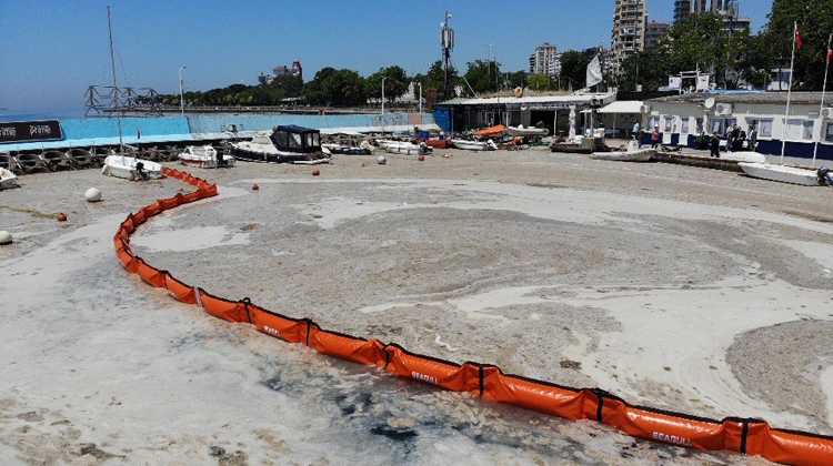 Caddebostan Sahili’ne gelen ekipler, akışkan deniz salyasının bir noktada birikmesi için denize bariyer çekti.
