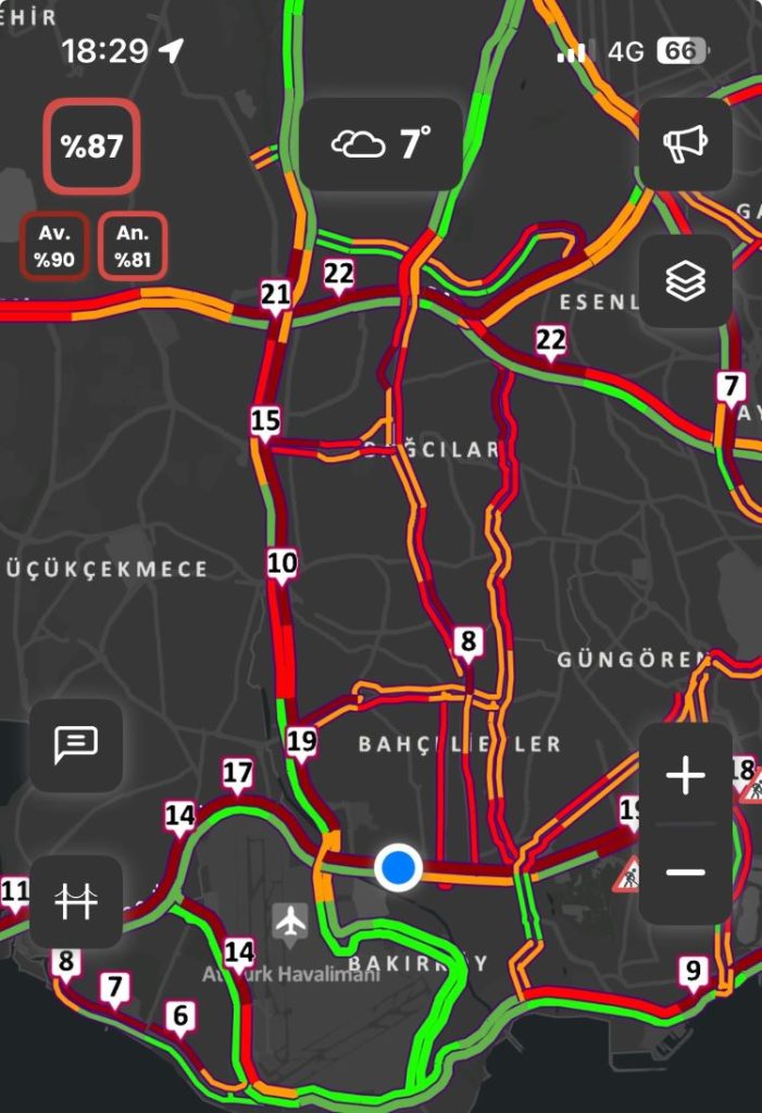 İstanbul’da trafik yoğunluğu akşam iş çıkış saatlerinde yağmurun da etkisiyle arttı. Avrupa Yakası’nda, D-100 karayolunda, Yenibosna, Sefaköy, Bahçelievler, Bakırköy’de araçlar adeta durma noktasına geldi. İstanbul Büyükşehir Belediyesi Trafik Yoğunluğu Haritası verilerine göre trafik yoğunluğu saat 18.30 itibariyle yüzde 87 olarak ölçüldü. D-100 Karayolu’nda araçlar ilerlemekte zorlanırken trafik durma noktasına geldi.
