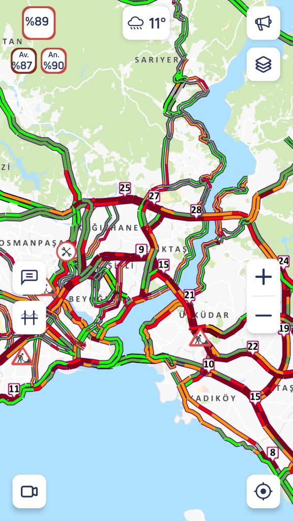 İstanbul’da akşam saatlerinde özellikle mesai çıkışı trafik yoğunluğu yaşandı. Mesai çıkışına yağmur da eklenince trafik yoğunluğu nedeniyle trafik adım adım ilerledi. İBB cep trafik uygulamasında trafik yoğunluğu yüzde 89 olarak ölçüldü. Trafik yoğunluğu Maltepe Köprüsü’nden görüntülendi.