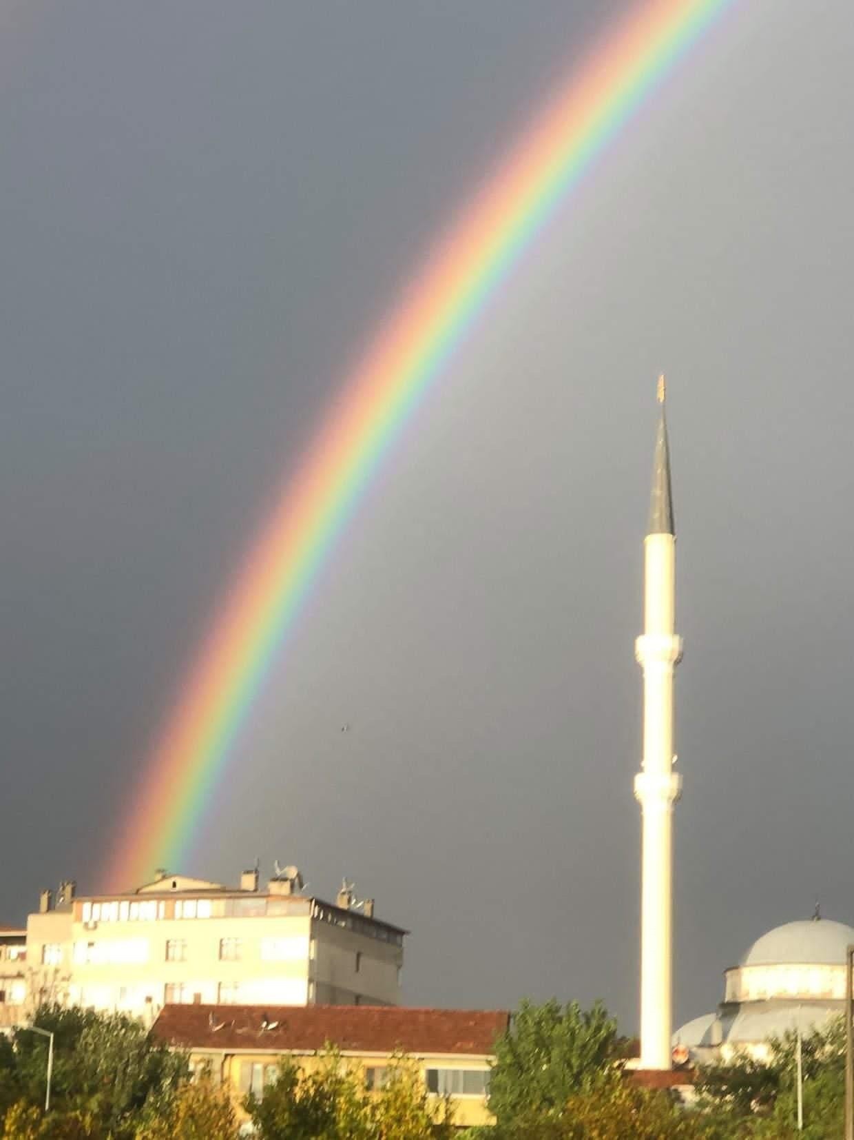 İstanbul’da kısa süreli etkili olan yağışlı havanın ardından gökyüzünde gökkuşağı belirdi. İstanbul Boğazı ve Alibeyköy’de oluşan gökkuşağı megakentin birçok noktasından görülürken, görsel bir şölen oluşturdu. 15 Temmuz Şehitler Köprüsüyle çekilen gökkuşağının görüntüsü ise kartpostallık görüntüler oluşturdu.