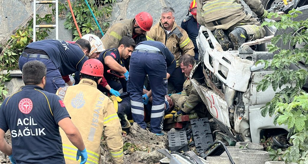 Başakşehir’de sürücüsünün kontrolünden çıkan bir kamyonet, reklam panolarına çarparak yıktıktan sonra MASKO Mobilyacılar Sitesi’nin bahçesine düştü. Kazada kamyonete sıkışan sürücü, itfaiye ekiplerinin uzun uğraşları sonucunda kurtarıldı. Sürücünün, 5 metre yükseklikten sitenin bahçesine düştüğü anlar güvenlik kamerasına yansıdı.