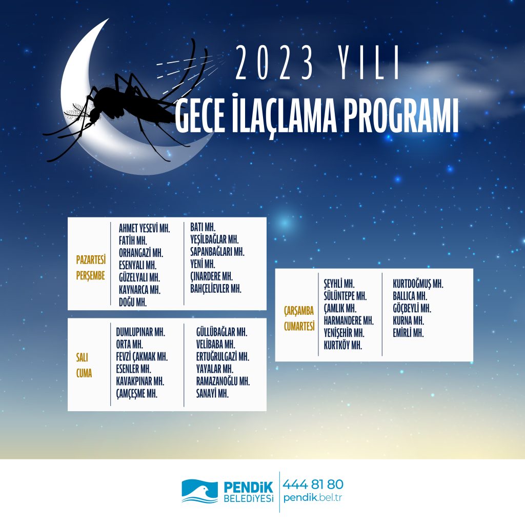 Pendik Belediyesi, ilçe genelinde ilaçlama çalışmalarına devam ediyor. Havaların ısınmasıyla birlikte üremeye başlayan sivrisinek, karasinek, pire, kene gibi kent zararlılarına yönelik ekipler harekete geçti. Mayıs ayı itibarıyla başlatılan ilaçlama çalışmalarına hız verildi. Ekipler çalışmalar öncesi özel ilaçlama eğitimleri aldı. Özellikle sivrisinek popülasyonunun kontrol altına alınması amacıyla tüm cadde, sokak, bina, boş arsa, mazgal, park, piknik alanı, dere ve gölet gibi durgun su noktalarına sahip olabilecek muhtemel üreme kaynağı tüm alanlar titizlikle incelenerek gerekli yerler ilaçlanıyor. Bunun yanı sıra ergin sivrisineklere yönelik geceleri araç üstü ilaçlama çalışmaları da yapılmaya başlandı. Ekipler yaz boyunca ilaçlamalarına devam edecek.