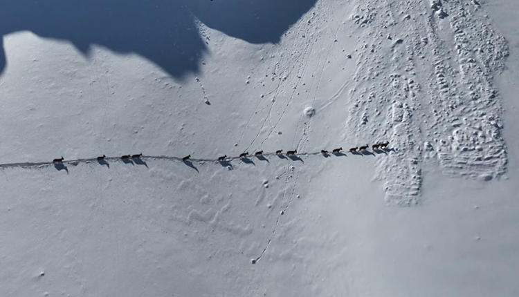 Munzur Dağları’nda yabani hayvan popülasyonunda artış gözlemlenirken, karla kaplanan bölgede birçok tür objektiflere yansımaya başladı. Yaklaşık 3 bin 300 rakımlı zirvelerde ve zaman zaman bin rakımlı kesimlere inen yaban keçileri, bu kez 2 bin 800 rakımda sürüler halinde göç ederken drone ile kaydedildi.