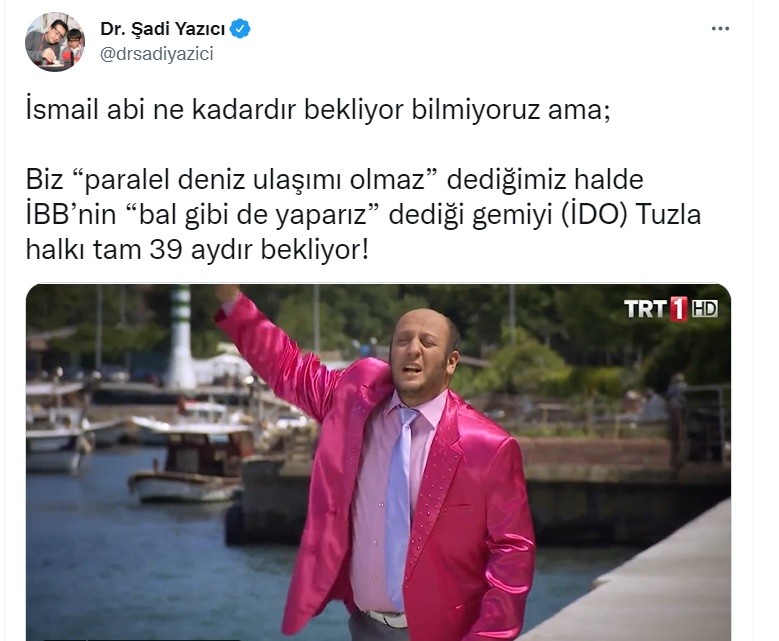 Tuzla Belediye Başkanı Dr. Şadi Yazıcı da İstanbul Büyükşehir Belediye Başkanı Ekrem İmamoğlu’nun yerel seçimler öncesinde Tuzla’da yaptığı mitingde “Tuzla’yı paralel deniz ulaşımı ile İstanbul’un batısına bağlayacağım” sözlerini hatırlattı. Ekrem İmamoğlu’nun paralel deniz ulaşımı vaadi ile ilgili daha önce “Öyle çıkıp otobüsün üstünden ‘Yalancı Pehlivanlar’ gibi vatandaşa yalan söylendi. Bu bir gün size hatırlatılır. Vatandaş hatırlatır ve sorar. Nerede bu hatlar? Nerede bu deniz otobüsleri” ifadelerini kullanan Başkan Yazıcı, bu sefer ünlü televizyon dizisi Leyla ile Mecnun’un ikonik karakteri İsmail Abi’yi kullanarak Ekrem İmamoğlu’na tepki gösterdi. Başkan Yazıcı, sosyal medya hesabından, ”İsmail abi ne kadardır bekliyor bilmiyoruz ama Biz “paralel deniz ulaşımı olmaz” dediğimiz halde İBB’nin “bal gibi de yaparız” dediği gemiyi (İDO) Tuzla halkı tam 39 aydır bekliyor” ifadelerini kullandı.