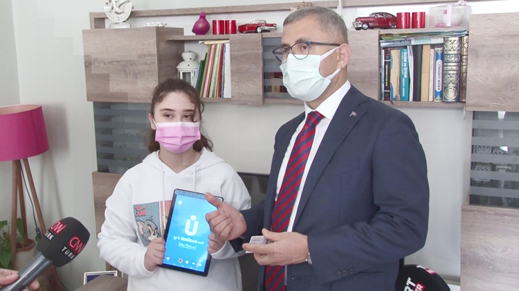 Başkan Türkmen, evine misafir olduğu 6. sınıf öğrencisi Ecrin Aydemir’e tabletini hediye etti. Kendi tabletinin bozulduğunu ifade eden Ecrin Aydemir, “Şimdi EBA’ya girmem daha kolay olacak” dedi.