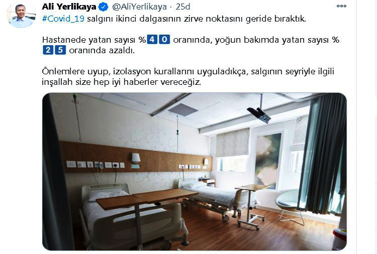 İstanbul Valisi Ali Yerlikaya sosyal medya hesabından yaptığı açıklamada, “Covid-19 salgını ikinci dalgasının zirve noktasını geride bıraktık. Hastanede yatan sayısı yüzde 40 oranında, yoğun bakımda yatan sayısı yüzde 25 oranında azaldı” dedi.
