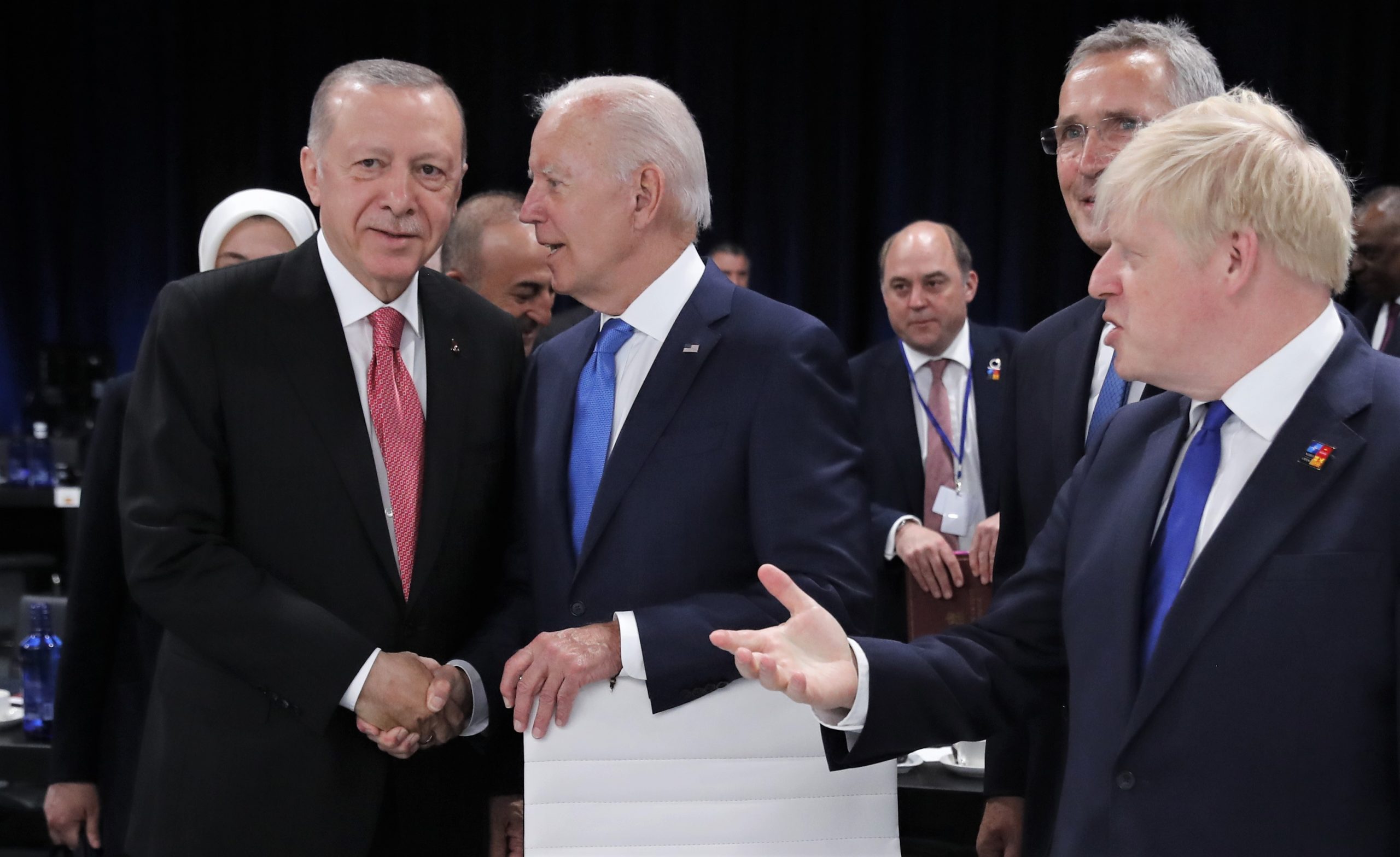 Cumhurbaşkanı Recep Erdoğan, NATO Zirvesi’nde ABD Başkanı Joe Biden ile konuştuğu sırada parmağıyla İngiltere Başbakanı Boris Johnson’ı işaret etti. Johnson ise Erdoğan’a Türkçe olarak “Çok güzel” dedi. Erdoğan Johnson’a aynı şekilde karşılık verince salondan kahkaha sesleri yükseldi.