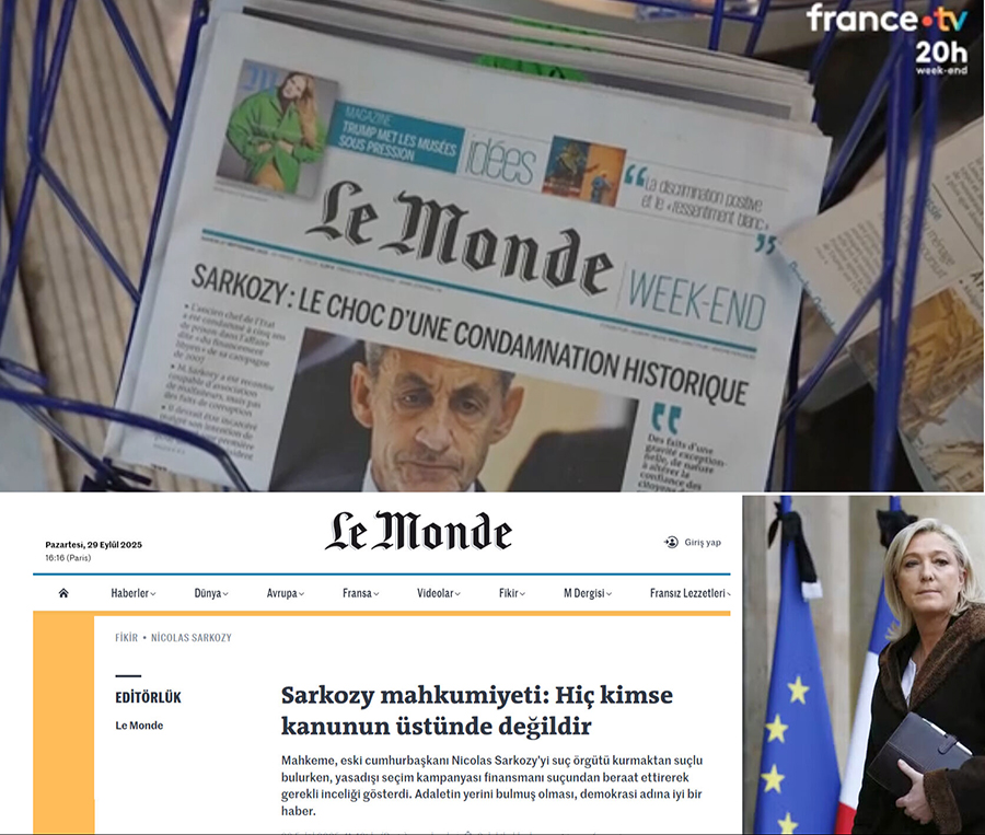İmamoğlu için algı yapan Le Monde gazetesi, Sarkozy hakkında mahkumiyet kararı veren mahkemeyi “tarihî bir zafer” diye övdü. Sık sık şeff afl ık çağrısında bulunan gazete, Sarkozy’nin yakın çevresiyle yolsuzluk ağı kurduğunu yazdı. Le Monde editörü Sarkozy mahkumiyeti için “Hiç kimse kanunun üstünde değildir. Adaletin yerini bulmuş olması, demokrasi adına iyi bir haber” ifadesini kullandı. Aynı gazete yargıyı eleştiren Sarkoyz’ye “Hakimlere saldırdı” diye öfke kustu. Mart ayında da Fransa’nın aşırı sağcı lideri Marine Le Pen’e yolsuzluktan yargılandığı davada 4 yıl hapis cezası verildi. Le Monde gazetesi kararı “yargı bağımsızlığının ve hukukun üstünlüğünün zaferi” diye nitelendirirken yargıyı da “demokrasinin bekçisi” diye övdü. Eski Fransa Başbakanı François Fillon da beş yıl önce yolsuzluktan mahkûm oldu. Le Monde gazetesi, tıpkı Sarkozy ve Le Pen’de olduğu gibi Fillon kararı için de “yargı zaferi” dedi. Kaynak: Türkiye Gazetesi