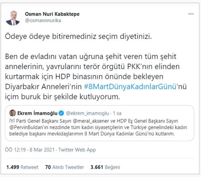 İmamoğlu’na tepki veren AK Parti İstanbul İl Başkanı Osman Nuri Kabaktepe, ”Ödeye ödeye bitiremediniz seçim diyetinizi. Ben de evladını vatan uğruna şehit veren tüm şehit annelerinin, yavrularını terör örgütü PKK’nın elinden kurtarmak için HDP binasının önünde bekleyen Diyarbakır Anneleri’nin 8 Mart Dünya Kadınlar Günü’nü içim buruk bir şekilde kutluyorum.” ifadelerini kullandı.