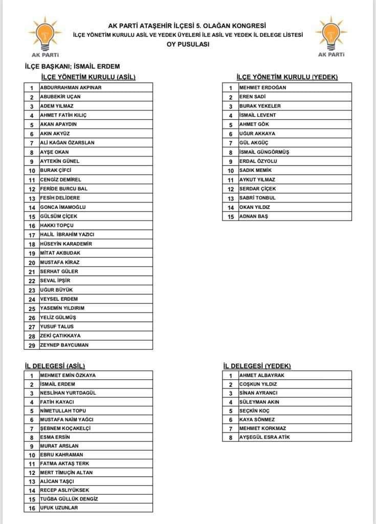 AK PARTİ ATAŞEHİR İLÇE YÖNETİM KURULU LİSTESİ VE İL DELEGELERİ