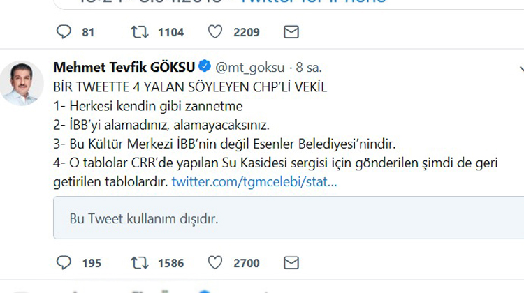 Kadir Topbaş Kültür Sanat Merkezi’nde yer alan bazı eserler “Ab-Rularda Su Kasidesi” sergisi kapsamında geçtiğimiz günlerde Cemal Reşit Rey Sergi Salonu’nda sergilenmesinin ardından merkeze geri getirildi. Konuyla ilgili CHP İzmir Milletvekili Mehmet Ali Çelebi’nin eserlerin kaçırıldığına yönelik iddiaları üzerine Esenler Belediyesi’nden açıklama geldi. Daha sonra Esenler Belediye Başkanı Mehmet Tevfik Göksu, iftirasını ortaya çıkarttığı Çelebi’ye Tweet’ini sildirtti!