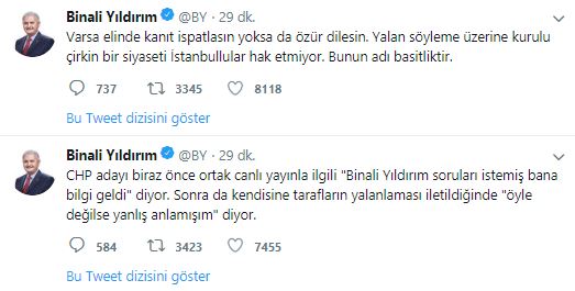 CHP adayı biraz önce ortak canlı yayınla ilgili “Binali Yıldırım soruları istemiş bana bilgi geldi” diyor. Sonra da kendisine tarafların yalanlaması iletildiğinde “öyle değilse yanlış anlamışım” diyor. Varsa elinde kanıt ispatlasın yoksa da özür dilesin. Yalan söyleme üzerine kurulu çirkin bir siyaseti İstanbullular hak etmiyor. Bunun adı basitliktir