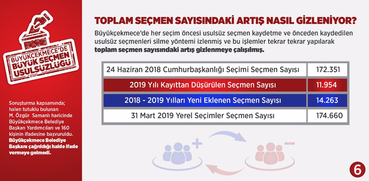 Yapılan usulsüzlüklerle ilgili Büyükçekmece Belediyesi’nden Nüfus Müdürlüğü’ne geçen Mehmet Özgür Samanlı isimli kişinin tutuklandığını hatırlatan Uysal, “Bu şahsın yapmış olduğu şilem sayısı diğer memurlarının yapmış olduğu işlem sayısının 4 katı. Günlük diğer çalışanlar 100 kayıt işlemi yaparken o şahsın yaptığı işlem sayısı 400. Belediyeden sahte adreslere kayıt yapılan seçmenlerin tamamına yakını o şahıs üzerinden gitmiş. 17 Ocak’ta biz şikayet dilekçesini verdik. 18 Ocak günü bu şahıs tutuklandı. Kendisine yardımcı olan şahıslardan Osman Doğan tutuklandı. Mesele artık savcılığa intikal etmiştir ama şu kadarını biliyoruz ki belediyede de bu işlemin organizasyonu adına görev alanlar muhakkak var ki bu kadar kalabalık bir seçmen kaydı trafiği oluşturulabilsin. 5 belediye başkan yardımcısı ve Belediye Başkanı Hasan Akgün’ün ifadeye çağrıldığını biliyoruz. Nihayetinde bu bir şekilde açığa çıkacaktır” dedi.