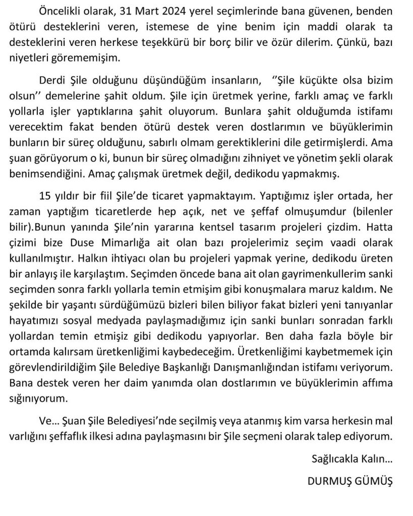 “Şile Belediyesi’nde seçilmiş veya atanmış kim varsa herkesin mal varlığını şeffaflık ilkesi adına paylaşmasını bir Şile seçmeni olarak talep ediyorum” diyen Durmuş Gümüş’ün yazısının tamamı aşağıdadır: