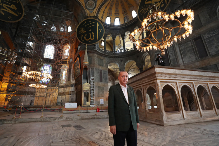 Cumhurbaşkanı Recep Tayyip Erdoğan, öğlen saatlerinde oğlu Bilal Erdoğan ve torunuyla beraber Üsküdar Kısklı’daki konutundan çıkarak 24 Temmuz’da ibadete açılacak Ayasofya Camii’ne geldi. Cumhurbaşkanı Erdoğan’ın camiye gelmesinden önce Kültür ve Turizm Bakanı Mehmet Ersoy, İstanbul Valisi Ali Yerlikaya, Diyanet İşleri Başkanı Prof. Dr. Ali Erbaş camiye geldi.