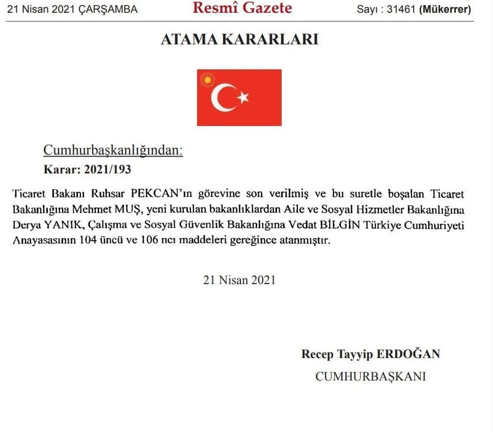 Cumhurbaşkanlığı kararnamesi ile Ticaret Bakanlığı görevine Mehmet Muş, Aile ve Sosyal Hizmetler Bakanlığı görevine Derya Yanık, Çalışma ve Sosyal Güvenlik Bakanlığına Vedat Bilgin getirildi.