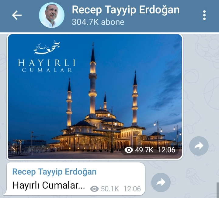 Cumhurbaşkanı Recep Tayyip Erdoğan, Telegram hesabından mesaj atarak milletin Cumasını tebrik etti. Cumhurbaşkanı Erdoğan, “Hayırlı Cumaalar” diye paylaşım yaptı.