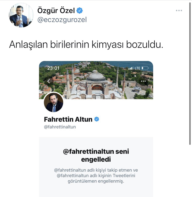 Cumhurbaşkanlığı İletişim Başkanı Fahrettin Altun, Cumhuriyet Halk Partisi Grup Başkan Vekili Özgür Özel’i Twitter hesabından engelledi.