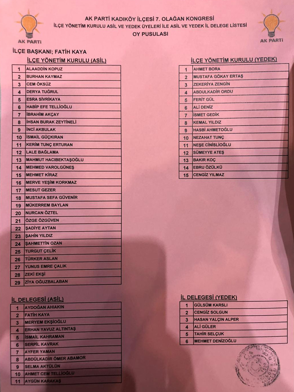 İLÇE BAŞKANI FATİH KAYA’NIN İLÇE YÖNETİMİ VE İL DELEGE LİSTESİ