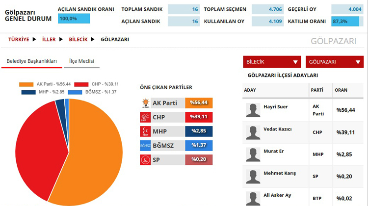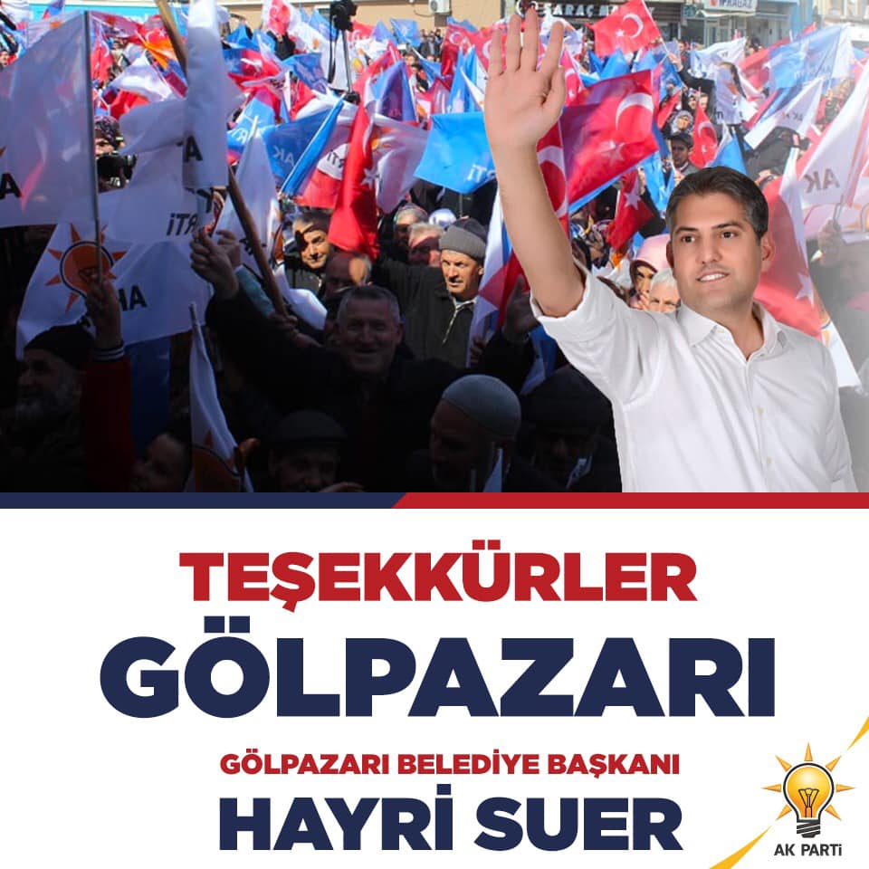 AK Parti Gölpazarı Belediye Başkan Adayı Hayrı Suer, rakiplerine fark atarak seçimleri kazandı. AK Parti’de gençlik kolları döneminden bu yana aktif siyasetin içinde olan tecrübeli isim Hayrı Suer, yüzde 56.44 yüzde ile 2.260 oy alarak Gölpazarı Belediye Başkanı oldu. Yaklaşık 43 yıldır CHP’nin elinde olan Gölpazarı Belediye Başkanlığını kazanan Hayri Suer, bir yanıyla da tarihi bir zafere imza attı diyebiliriz…