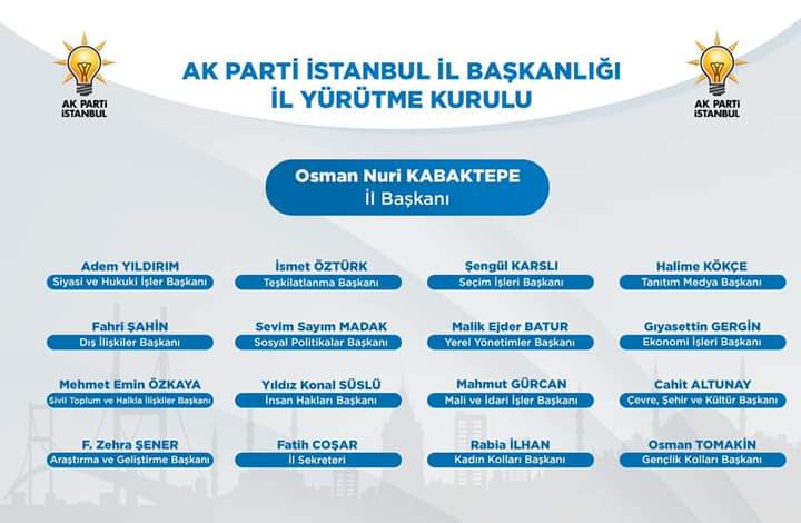 AK Parti İstanbul İl Başkanı Osman Nuri Kabaktepe Başkan Yardımcıları kadrosunu açıkladı. AK Parti İstanbul 7. Olağan İl Kongresinde güçlü bir yönetim oluşturan Başkan Kabaktepe, tecrübeli isimlerden oluşan Yürütme Kurulu oluşturdu.