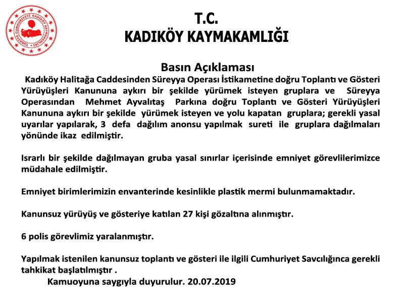 Yaşanan olaylara ilişkin Kadıköy Kaymakamlığı yazılı bir açıklama yaptı. Açıklamada, yaşanan olaylar sırasında 6 polisin yaralandığı, 27 şüphelinin gözaltına alındığını belirtti. Sosyal medyada polisin plastik mermi kullandığı yönündeki iddialara da cevap verilen açıklamada, “Emniyet birimlerimizin envanterinde kesinlikle plastik mermi bulunmamaktadır” denildi.