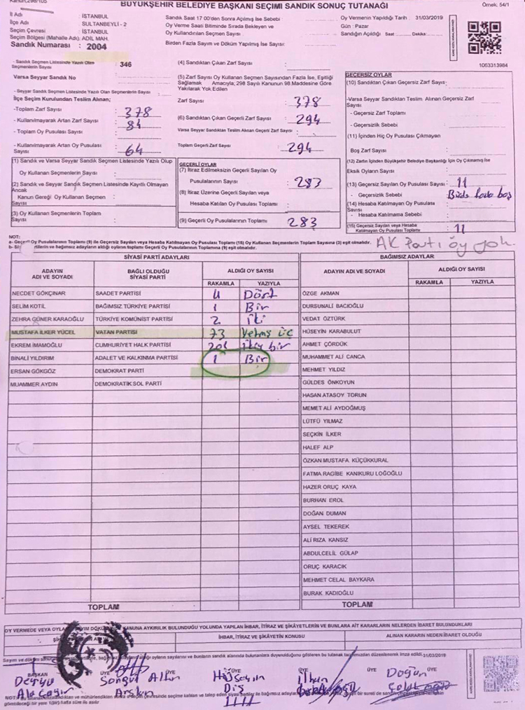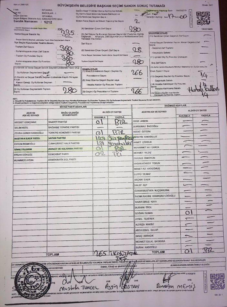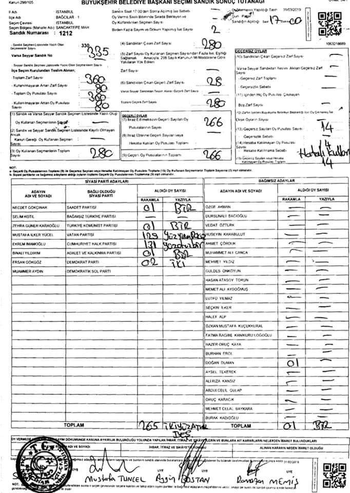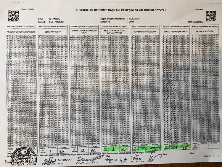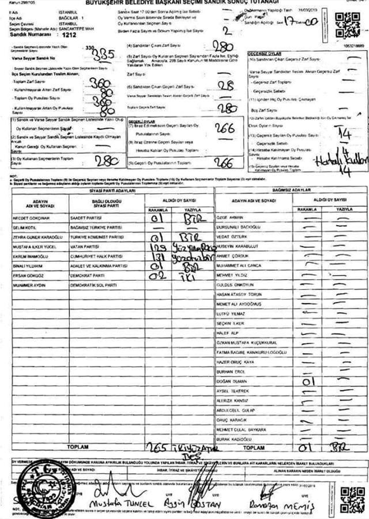Bağcılar’da sandık kurulunda sandık başkanı ve kurul üyeleri tarafından imzalanan sayım döküm çizelgesinde AK Parti İstanbul Büyükşehir Belediye Başkan adayına 131 oy çıktığı fakat bu rakamın sandık sonuç tutanağına 01 olarak aktarıldığı görülüyor. Sultanbeyli’de sandık kurulunda sandık başkanı ve kurul üyeleri tarafından imzalanan başka bir sayım döküm çizelgesinde ise AK Parti İstanbul Büyükşehir Belediye Başkan adayına 201 oy çıktığı fakat bu rakamın sandık sonuç tutanağına 01 olarak aktarıldığı görülüyor.