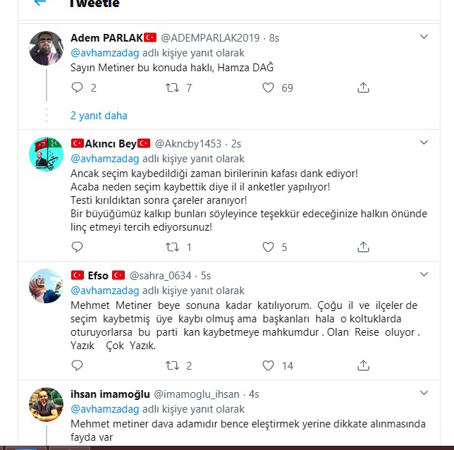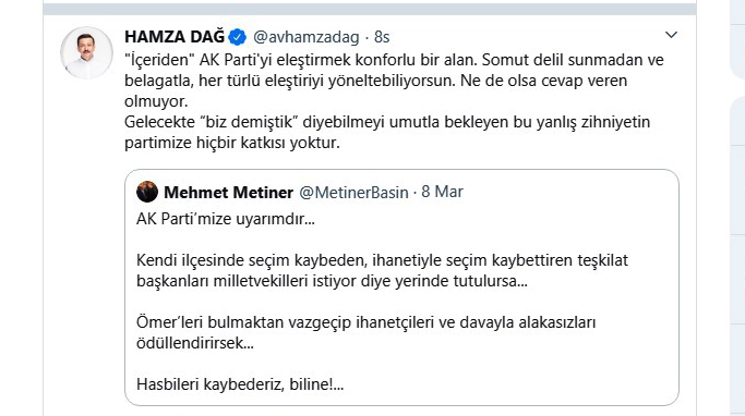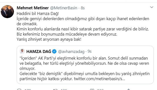 Mehmet Metiner, “Haddini bil Hamza Dağ! İçeride gemiyi delenlerden olmadığımız gibi dışarı kaçıp ihanet edenlerden de olmadık. Kimin konforlu alanlarda nasıl kibir satarak partiye zarar verdiğini de biliriz. Biz kefenimiz boynumuzda mücadeleye devam ediyoruz. Yanlış zihniyet arıyorsan aynaya bak!”
