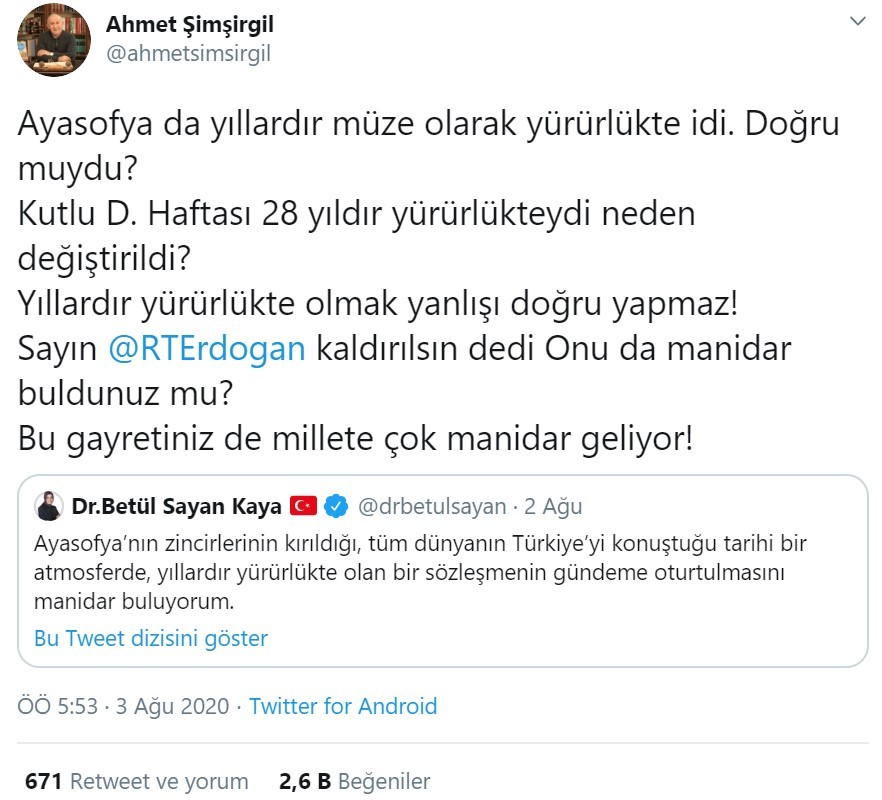 İfsat projesi İstanbul Sözleşmesi’nde büyük emeği olan AK Partili eski Aile Bakanı Fatma Betül Sayan Kaya, sözleşmeye sahip çıktı. Tarihçi Yazar Ahmet Şimşirgil ise Kaya’ya tepki gösterdi ve” ‘Sayın Erdoğan kaldırılsın’ dedi, onu da manidar buldunuz mu? Bu gayretiniz de millete çok manidar geliyor!” ifadelerini kullandı.