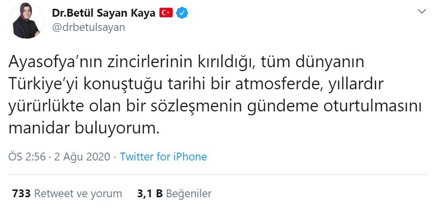 Sosyal medya hesabından açıklama yapan AK Partili Kaya, “Ayasofya’nın zincirlerinin kırıldığı, tüm dünyanın Türkiye’yi konuştuğu tarihi bir atmosferde, yıllardır yürürlükte olan bir sözleşmenin gündeme oturtulmasını manidar buluyorum.” ifadelerini kullandı.