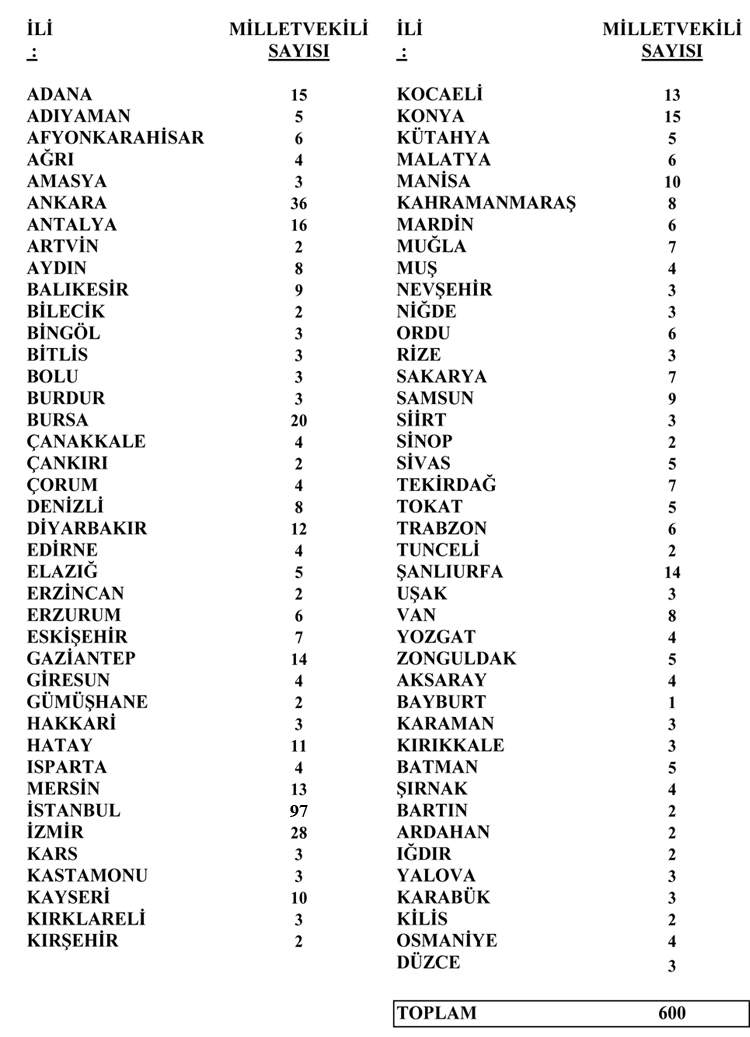 BUNA GÖRE, MİLLETVEKİLLERİNİN İLLERE GÖRE DAĞILIMI ŞÖYLE: