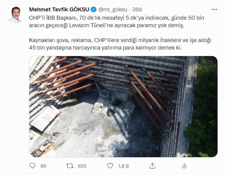 İBB AK Parti Grup Başkanvekili ve Esenler Belediye Başkanı Mehmet Tevfik Göksu, sosyal medyadan yaptığı paylaşımla Dolmabahçe-Levazım Tüneli projesini durduran İstanbul Büyükşehir Belediye Başkanı Ekrem İmamoğlu’na tepki gösterdi.