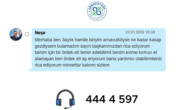 Arnavutköy’de yaşayan 3 aylık hamile Neşe Yücel’in, aşerdiği ördek etini ilçede temin edemediğini belirterek belediyeye yaptığı başvuru, duyarlı bir refleksle karşılık buldu. Anne adayının talebi, Arnavutköy Belediye Başkanı Mustafa Candaroğlu’nun doğrudan talimatıyla gece saatlerinde değerlendirilerek kısa sürede çözüme kavuşturuldu.