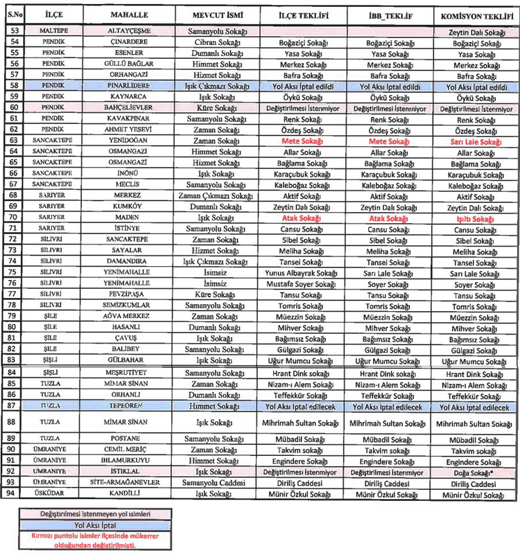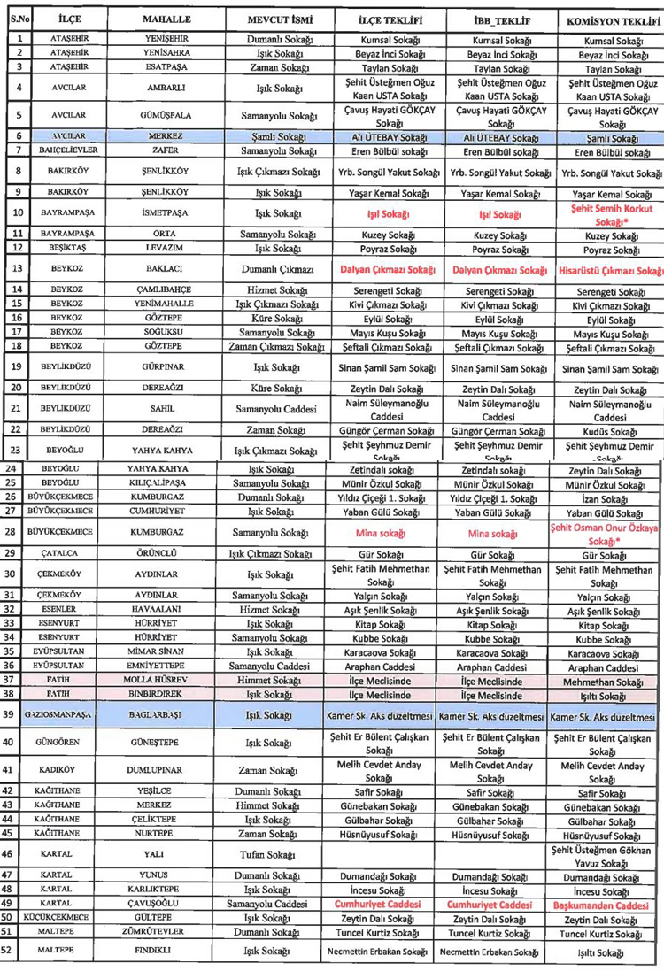 İstanbul Büyükşehir Belediye Meclisi, çeşitli ilçelerdeki Fetullahçı Terör Örgütü’nü çağrıştıran 90 cadde ve sokak isminin değiştirilmesini kararlaştırdı. Ekim ayı toplantılarının son birleşiminde görüşülen raporda; zaman, hizmet, himmet, ışık, samanyolu, dumanlı v.b. isimleri taşıyan cadde ve sokakların isminin değiştirilmesi, meclis üyelerinin oy birliğiyle kabul edildi.