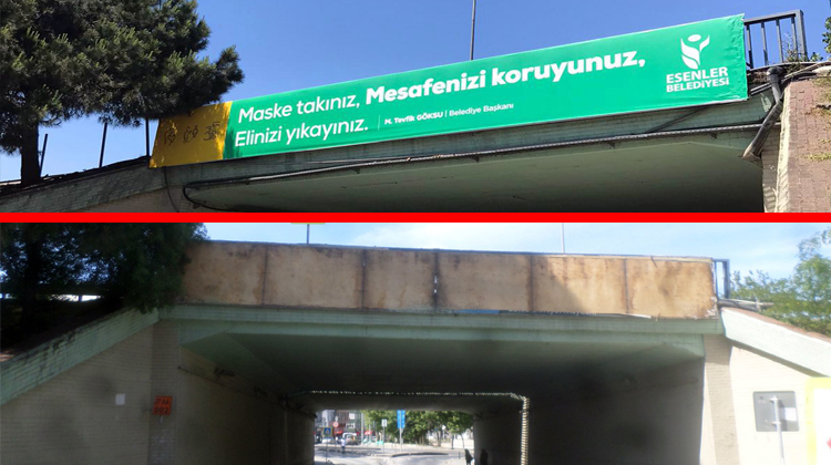 Korona virüsle mücadelede Esenler Belediyesi virüsün ortaya çıkmasından bu yana vatandaşları bilgilendirmeye yönelik çalışmalar yürütüyor. Normale geçiş döneminde de bu konuda faaliyet yürüten Esenler Belediyesi ilçede köprülerden, üst geçitlere, cadde ve meydanlardan parklara kadar birçok noktaya virüsle mücadelenin yeni döneminde vatandaşı bilgilendirici afişler asmaya devam etti. Belediye son çalışmasında bütün tanıtım mecralarına “Maske takınız, mesafenizi koruyunuz, elinizi yıkayınız” afişleri astı. Ancak İstanbul Büyükşehir Belediyesi, vatandaşları bilgilendirmek amacıyla Esenler Belediyesi’nin köprü, üst geçit ve çevre yollarına astığı korona virüs ile ilgili afişleri toplayarak imha etti.