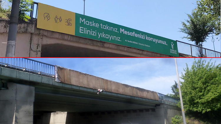 Esenler Belediyesi sosyal medya hesaplarından bilgilendirici afişin olduğu bir üst geçit ile daha sonra aynı üst geçitin afişlerden sökülmüş boş hali fotoğrafını paylaştı. Paylaşımda, “Dünya olarak zor günlerden geçiyoruz. Bugünlerde birlik ve beraberliğe daha çok ihtiyaç duyuyoruz. Ancak Yeni korona virüs ile mücadele için kullandığımız ve vatandaşları bilgilendirdiğimiz tanıtım mecralarımızdaki afişler İBB tarafından sökülmüştür” yazıldı.
