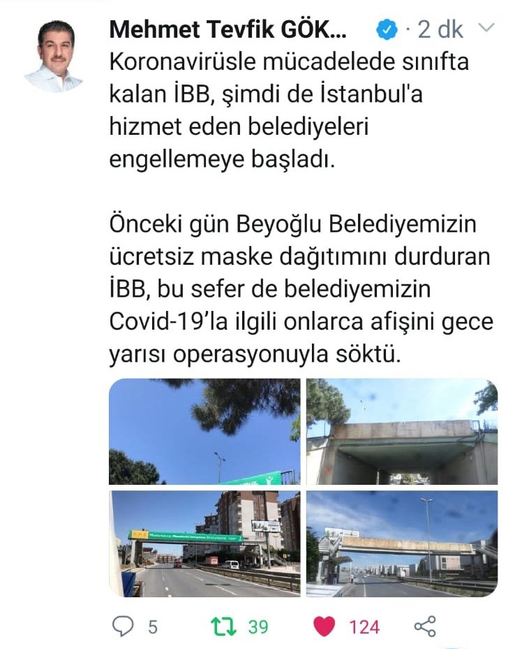 Bunun üzerine Esenler Belediye Başkanı ve İBB AK Parti Grup Başkanvekili Mehmet Tevfik Göksu sosyal medya hesabından İBB’ye sert tepki gösterdi. Başkan Göksu yaptığı paylaşımda, “Korona virüsle mücadelede sınıfta kalan İBB, şimdi de halka hizmet eden belediyeleri engelliyor. Dün Beyoğlu Belediyesi’nin ücretsiz maske dağıtımını durduran İBB, şimdi de belediyemizin Covid-19’la ilgili onlarca afişini gece yarısı operasyonuyla söktü” dedi.