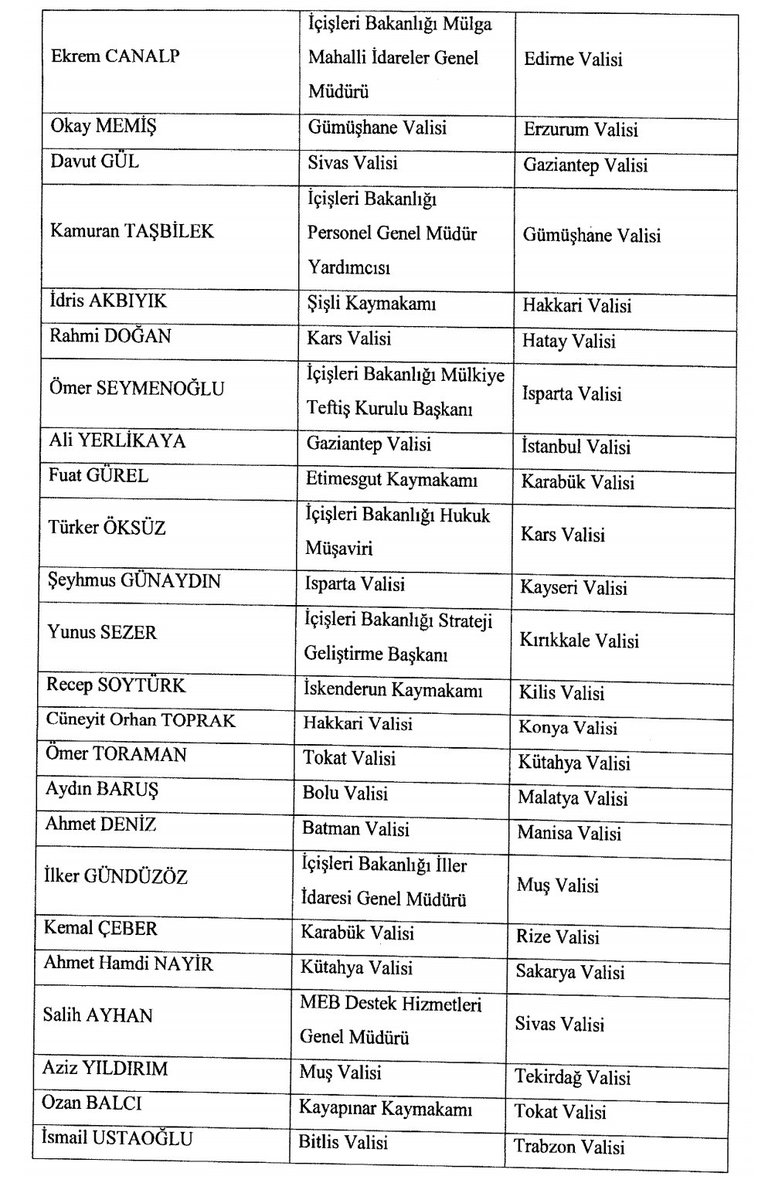 Aksaray Valisi Aykut Pekmez Adıyaman Valiliğine, Bingöl Valisi Ali Mantı Aksaray Valiliğine, İstanbul Valisi Vasip Şahin Ankara Valiliğine, İçişleri Bakanlığı Mülga Dernekler Dairesi Başkanı Yılmaz Doruk Artvin Valiliğine, İçişleri Bakanlığı Nüfus ve Vatandaşlık İşleri Genel Müdürü Sinan Güler Bartın Valiliğine, Esenler Kaymakamı Hulusi Şahin Batman Valiliğine, Beypazarı Kaymakamı Kadir Ekinci Bingöl Valiliğine, Gaziosmanpaşa Kaymakamı Oktay Çağatay Bitlis Valiliğine, Yıldırım Kaymakamı Ahmet Ümit Bolu Valiliğine, Konya Valisi Yakup Canbolat Bursa Valiliğine, TBMM Başkan Müşaviri Mustafa Çiftçi Çorum Valiliğine, İçişleri Bakanlığı Mülga Mahalli İdareler Genel Müdürü Ekrem Canalp Edirne Valiliğine, Gümüşhane Valisi Oktay Memiş Erzurum Valiliğine, Sivas Valisi Davut Gül Gaziantep Valiliğine, İçişleri Bakanlığı Personel Genel Müdür Yardımcısı Kamuran Taşbilek Gümüşhane Valiliğine, Şişli Kaymakamı İdris Akbıyık Hakkari Valiliğine, Kars Valisi Rahmi Doğan Hatay Valiliğine, İçişleri Bakanlığı Mülkiye Teftiş Kurulu Başkanı Ömer Seymenoğlu Isparta Valiliğine, Gaziantep Valisi Ali Yerlikaya İstanbul Valiliğine, Etimesgut Kaymakamı Fuat Gürel Karabük Valiliğine, İçişleri Bakanlığı Hukuk Müşaviri Türker Öksüz Kars Valiliğine, Isparta Valisi Şeyhmus Günaydın Kayseri Valiliğine, İçişleri Bakanlığı Strateji Geliştirme Başkanı Yunus Sezer Kırıkkale Valiliğine, İskenderun Kaymakamı Recep Soytürk Kilis Valiliğine, Hakkari Valisi Cüneyt Orhan Toprak Konya Valiliğine, Tokat Valisi Ömer Toraman Kütahya Valiliğine, Bolu Valisi Aydın Barkuş Malatya Valiliğine, Batman Valisi Ahmet Deniz Manisa Valiliğine, İçişleri Bakanlığı İller İdaresi Genel Müdürü İlker Gündüzöz Muş Valiliğine, Karabük Valisi Kemal Çeber Rize Valiliğine, Kütahya Valisi Ahmet Hamdi Nayir Sakarya Valiliğine, MEB Destek Hizmetleri Genel Müdürü Salih Ayhan Sivas Valiliğine, Muş Valisi Aziz Yıldırım Tekirdağ Valiliğine, Kayapınar Kaymakamı Ozan Balcı Tokat Valiliğine, Bitlis Valisi İsmail Ustaoğlu Trabzon Valiliğine, MEB Avrupa Birliği ve Dış İlişkiler Genel Müdürü Funda Kocabıyık Uşak Valiliğine, Merkez Valisi Muammer Erol Yalova Valiliğine, Çankaya Kaymakamı Kadir Çakır Zonguldak, Mülkiye Başmüfettişi Mehmet Alparslan Işık Mülkiye Teftiş Kurulu Başkanlığına, Mülkiye Başmüfettişi Ali Çelik İller İdaresi Genel Müdürlüğüne, Mülkiye Müfettişi Hüseyin Kürşat Kırbıyık Strateji Geliştirme Başkanlığına, İçişleri Bakanlığı Nüfus ve Vatandaşlık İşleri Genel Müdür Yarımcısı Hüseyin Engin Sarıibrahim İçişleri Bakanlığı Nüfus ve Vatandaşlık İşleri Genel Müdürlüğüne, İçişleri Bakanlığı Göç İdaresi Genel Müdür Yardımcısı Abdullah Ayaz İçişleri Bakanlığı Göç İdaresi Genel Müdürlüğüne, Öğretim Üyesi Gökçe Ok İçişleri Bakanlığı Göç İdaresi Genel Müdür Yardımcılığına atandı.