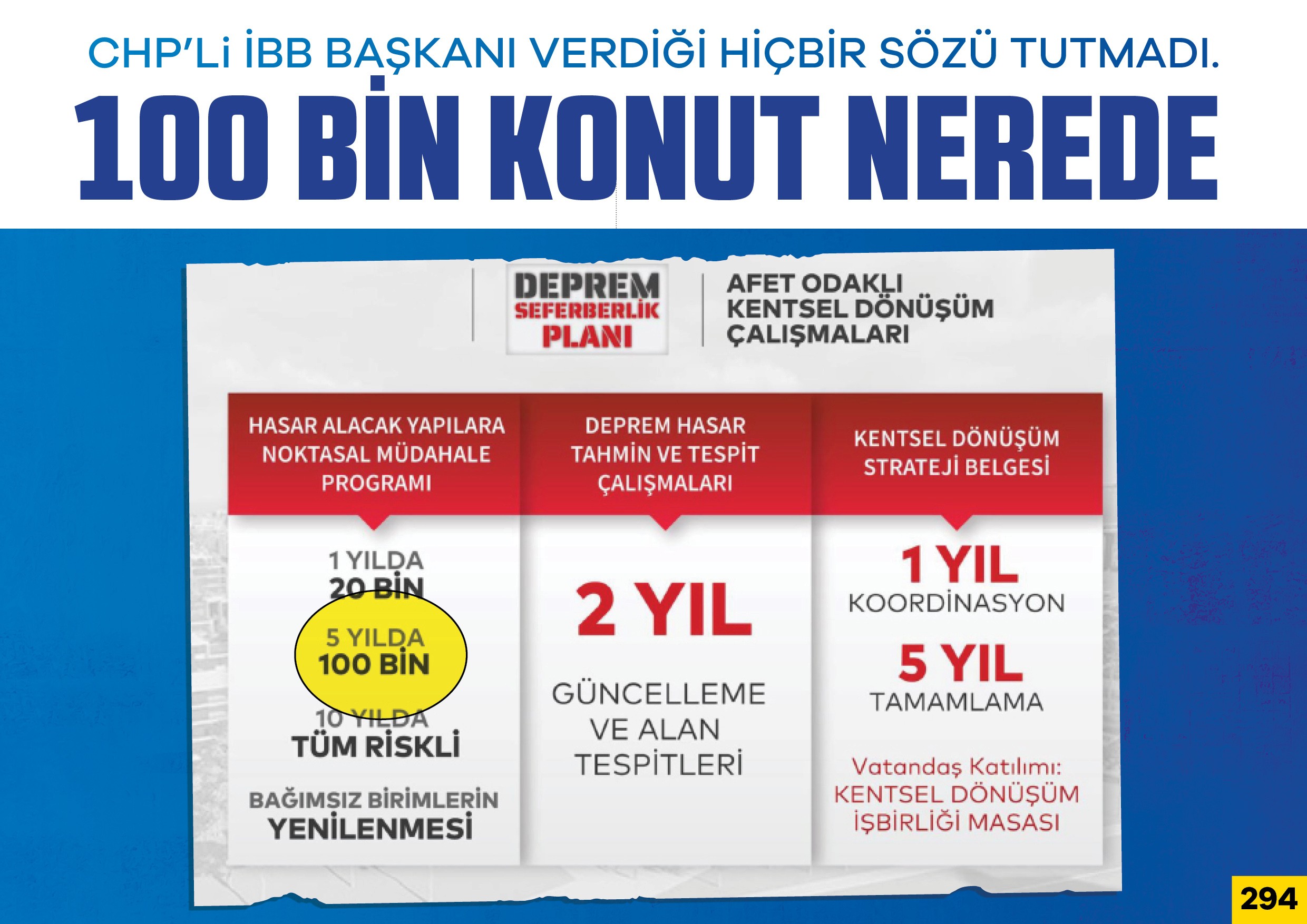 CHP’li İBB Başkanı’nın her yıl 20 bin konut vaadine rağmen bugüne kadar 1 tane bile konut teslim etmediğine dikkat çeken Ekşi, “CHP’li İBB Başkanı her yıl 20 bin, 5 yılda ise toplam 100 bin konut yapacağını vadetti. 3 yıla yaklaşan görev süresi boyunca yapıp teslim ettiği bir tane dahi konut yok. Verdiği söze gör şimdiye kadar 60 bin konutu teslim etmesi gerekiyordu. 1 tane konut bile teslim etmedi. Hiçbir faaliyetinizde kentin deprem direncini yükseltmeye dönük olarak yenilediğiniz tek bir bina bile yokken, ‘İstanbul yenileniyor’ diye reklam yapmak neyin nesidir? 20 yıl içerisinde KİPTAŞ yılda 4 bin, toplamda ise 80 bin konut yaptı. CHP yönetiminde KİPTAŞ’ın kentsel dönüşüm kapsamında yapıp teslim ettiği konut sayısı sıfır. Kocaman bir sıfır” dedi.