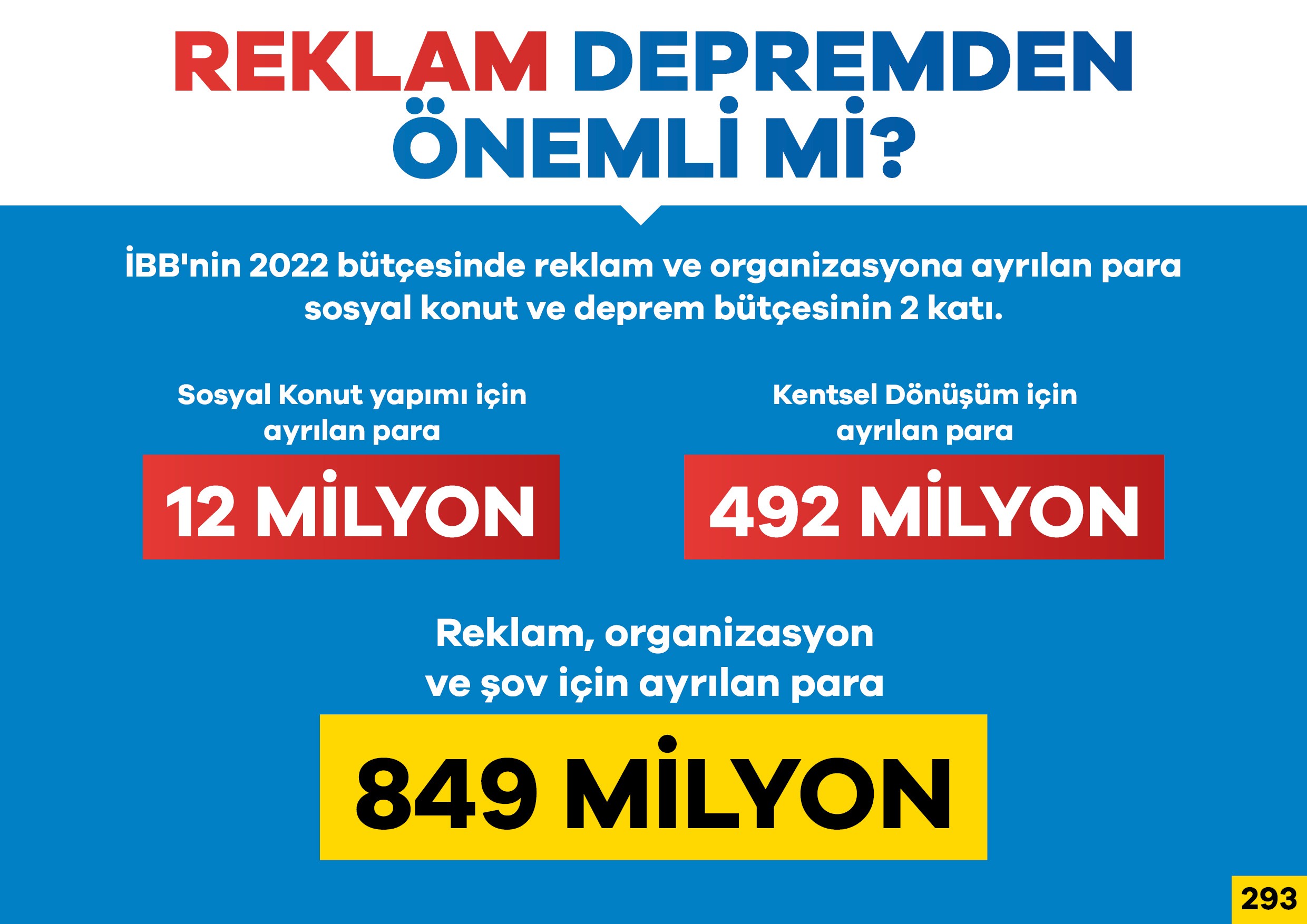 CHP’li İBB yönetiminin reklam ve tanıtımı, depremden daha çok önemsediğini belirten Ekşi, “AK Parti döneminde İBB’nin deprem bütçesi 1 milyar 12 milyon TL’ydi. CHP döneminde bu bütçe yarıdan da fazla azaltıldı. 2022 yılı için deprem bütçesi 492 milyon TL olarak belirlendi. İBB’nin 2022 yılı bütçesinde sosyal konut yapımı için ayrılan bütçe 12 milyon TL, kentsel dönüşüm için ayrılan bütçe 492 milyon TL, reklam için ayrılan bütçe ise 849 milyon TL. Reklam, depremden daha mı önemli?” sorusunu yöneltti.