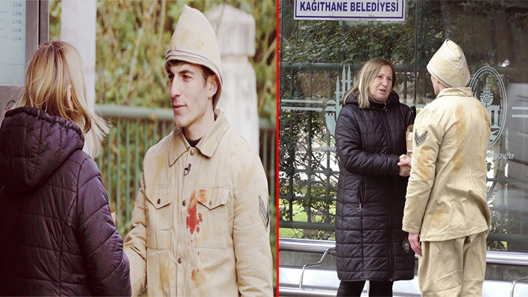 Kağıthane Belediyesi, sosyal medya hesaplarından paylaştığı video ile Çanakkale Zaferi’ni adeta günümüze taşıdı. Videoda temsili olarak Mehmet adında 18 yaşında Çanakkale’de şehit olmuş bir asker, Kağıthane sokaklarında vatandaşlara üzüm hoşafı ve ekmek ikram ediyor. ‘İsimlerimizi unutsanız bile bu vatan için toprağa düşen bizleri unutmayın’ diyen askere karşı vatandaşların duygulandığı, kimisinin hayır duada bulunduğu gözleniyor.