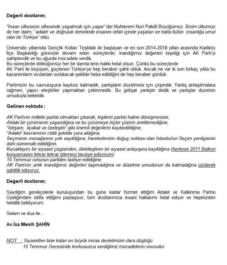 AK Parti Kadıköy 5. Dönem İlçe Başkanı Av. İsa Mesih Şahin, sosyal medya hesabından partisinden istifa ettiğini açıkladı.