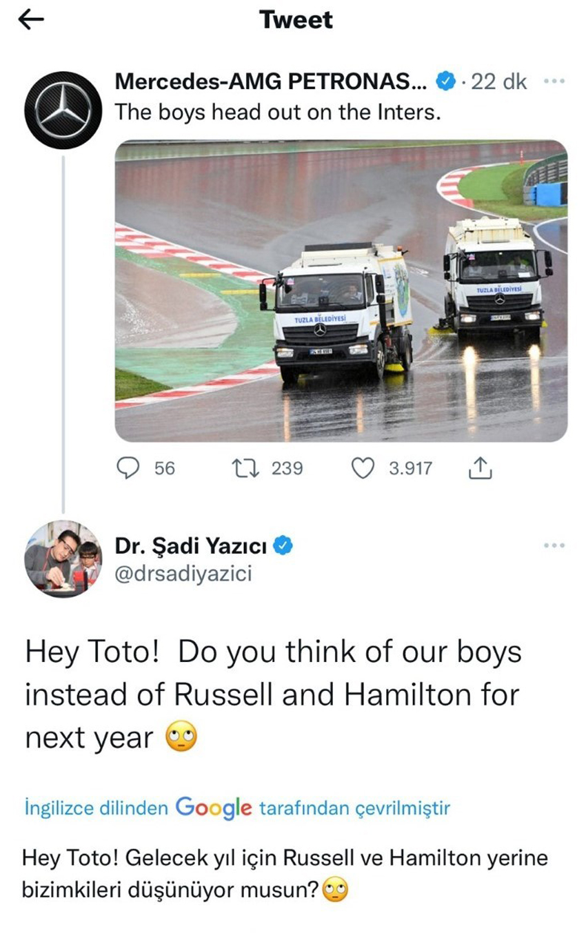 Dünyanın en büyük motor sporları organizasyonu olan Formula 1’de heyecan İstanbul’da yaşanıyor. Formula 1’in antrenman seansında etkili olan yağmuru kurutmak için piste çıkan Tuzla Belediyesi Süpürme Araçları yine dünyanın gündemine oturdu. Antrenman seansında istediği sonuçları alamayan Mercedes takımı, antrenman sıralamalarını Tuzla Belediyesi’nin araçlarının görsellerini kullanarak paylaştı. Tuzla Belediye Başkanı Doktor Şadi Yazıcı, Mercedes pilotlarına gönderme yaparak, paylaşılan görselin altına şunları yazdı: ”Önümüzdeki sene için Russell ve Hamilton’ın yerine bizim çocukları mı düşünüyorsun?”