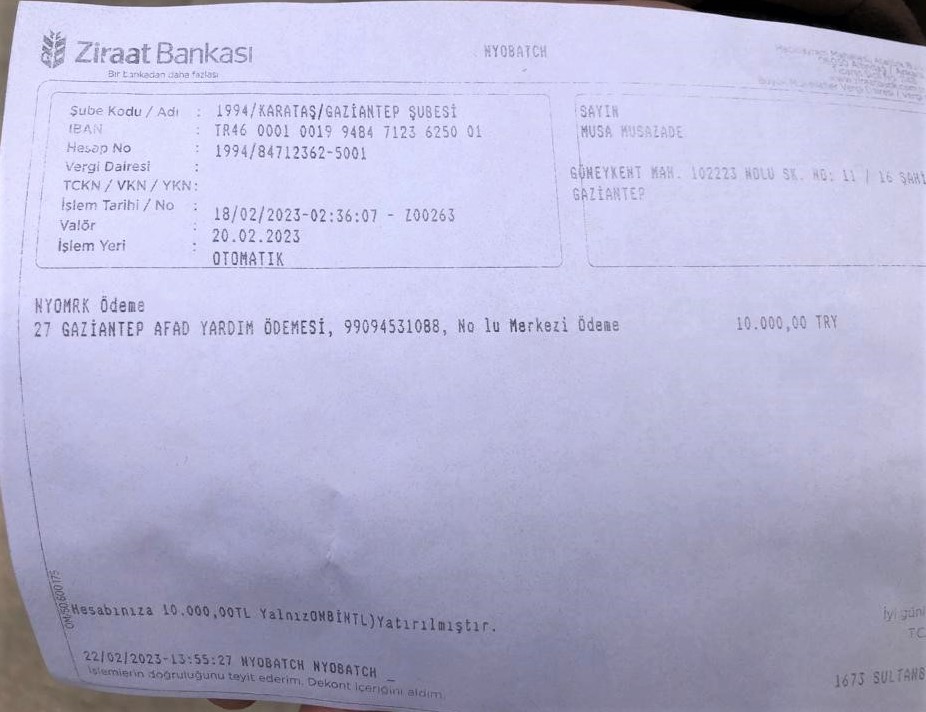 Üniversite öğrenimini gördükten sonra ikamet kaydı halen Gaziantep’te bulunan Azerbaycanlı genç, kendi hesabına yatan 10 bin liralık deprem yardımını “Ben depremzede değilim, ihtiyacım yok” diyerek geri iade etti.