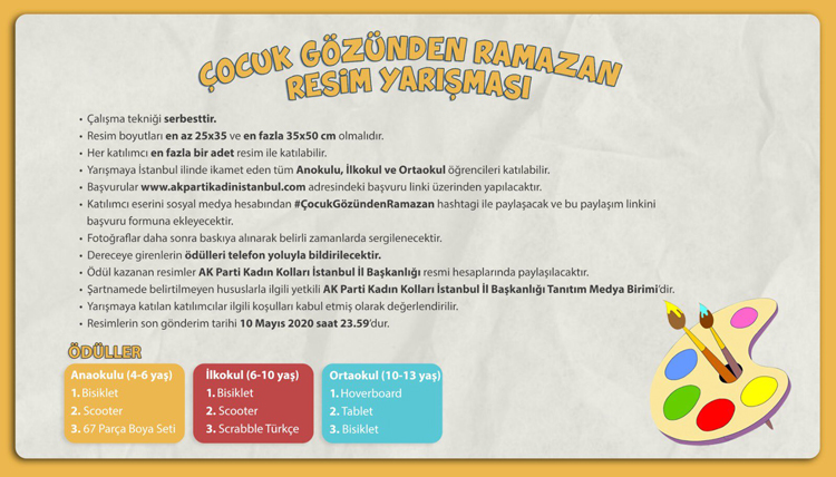 AK Parti İstanbul İl Kadın Kolları, Çocukların gözünden Ramazan temalı resim yarışması düzenliyor. 4-13 yaşları arasında çocukları için yapılan resim yarışmasında dereceye girenlere ödüller verilecek.