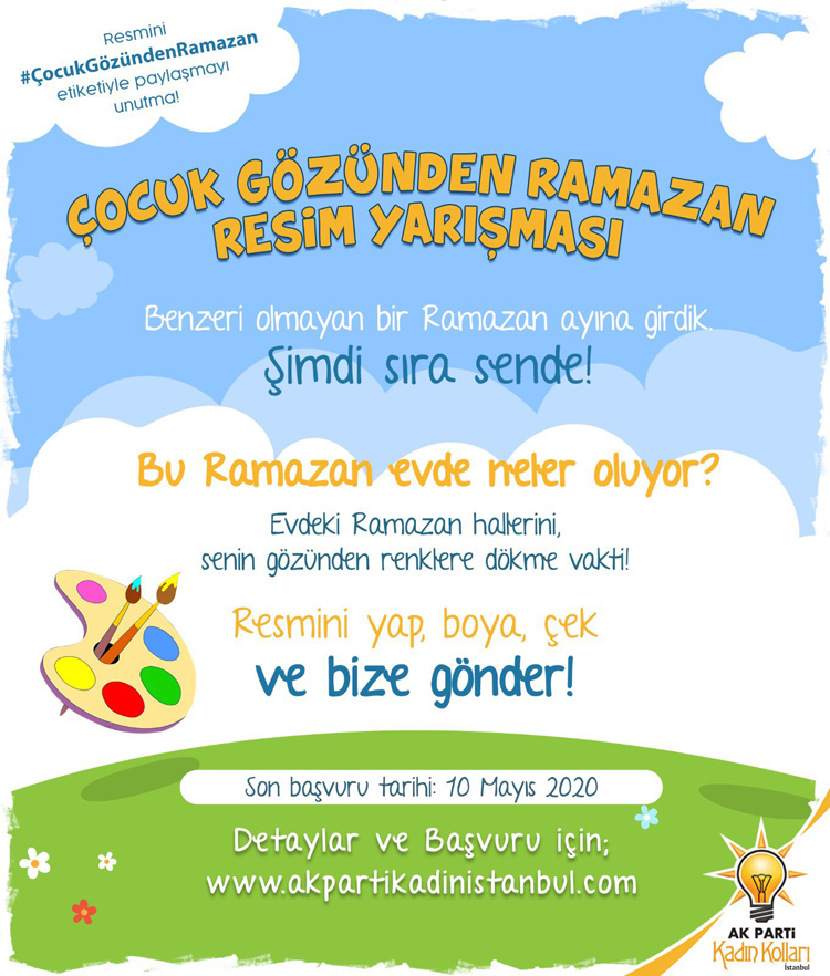 İstanbul İl Kadın Kollarından yapılan açıklamada “Evdeki Ramazan hallerinin senin gözünle resmini yap, renklere dök, resminin fotoğrafını çek ve 10 Mayıs 2020 tarihine kadar bize yolla, birbirinden harika ödülleri kazanma şansını yakala!”